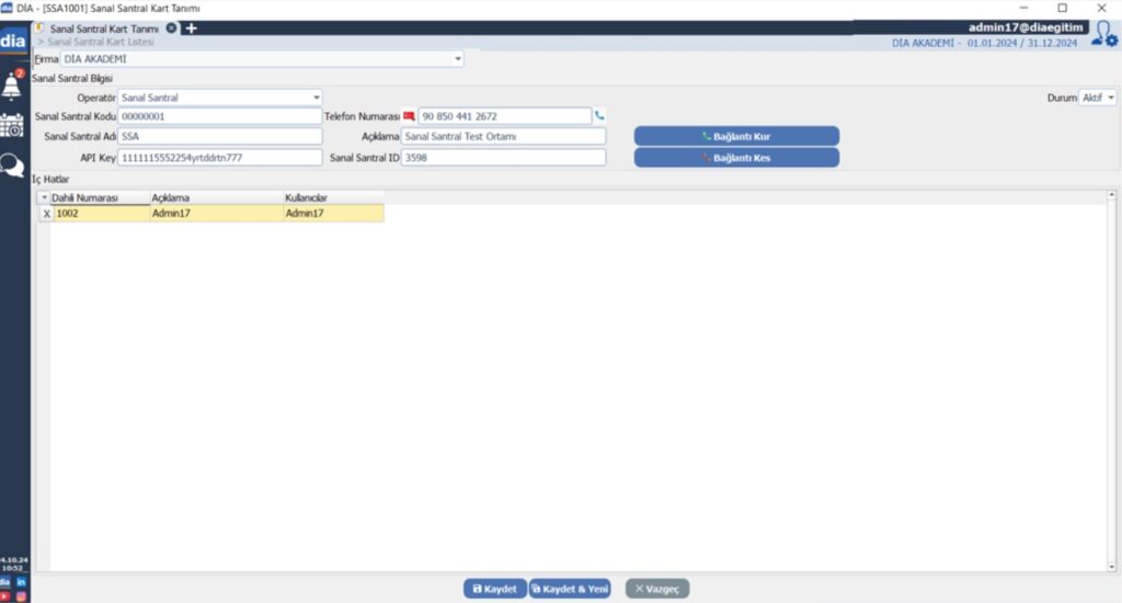 DİA’da (SSA1000) Sanal Santral Kart Tanımı ekranında ayarlar yapılmalıdır. Sanal santral tanımı firma bazlı çalışmaktadır.