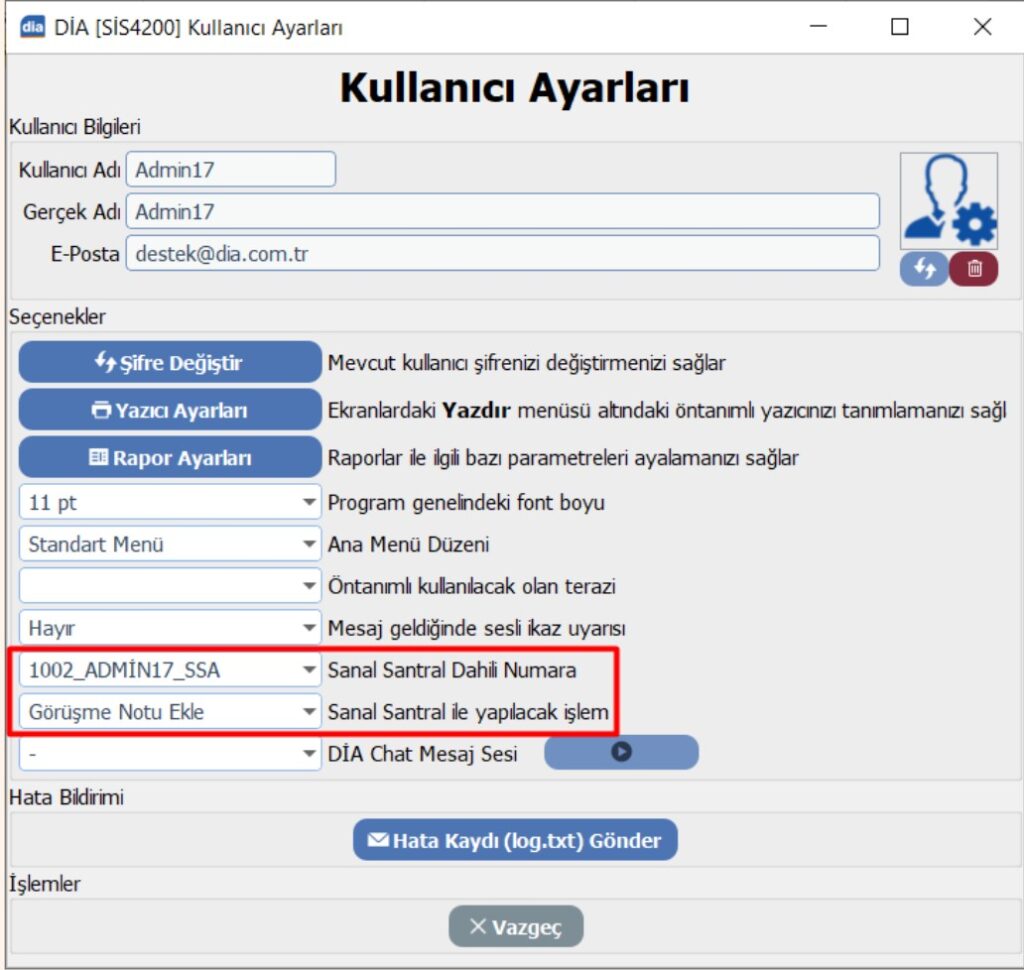 (SİS4200) Kullanıcı Ayarları ekranında kullanıcı için Sanal Santral Dahili Numara seçilmelidir. Kullanıcı Sanal Santral İle Yapılacak İşlem alanından ilgili seçeneği seçerek DİA’ya sanal santral entegrasyonu üzerinden gelen çağrılarda ilgili ekrana yönlendirilmesi yapılacaktır.